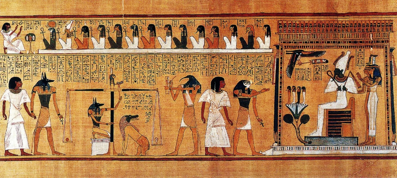 Cecil Palmer: A framed papyrus scroll of the weighing of hearts in the Egyptian Underworld.